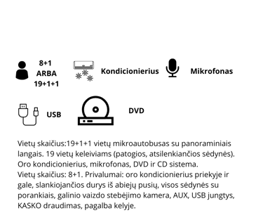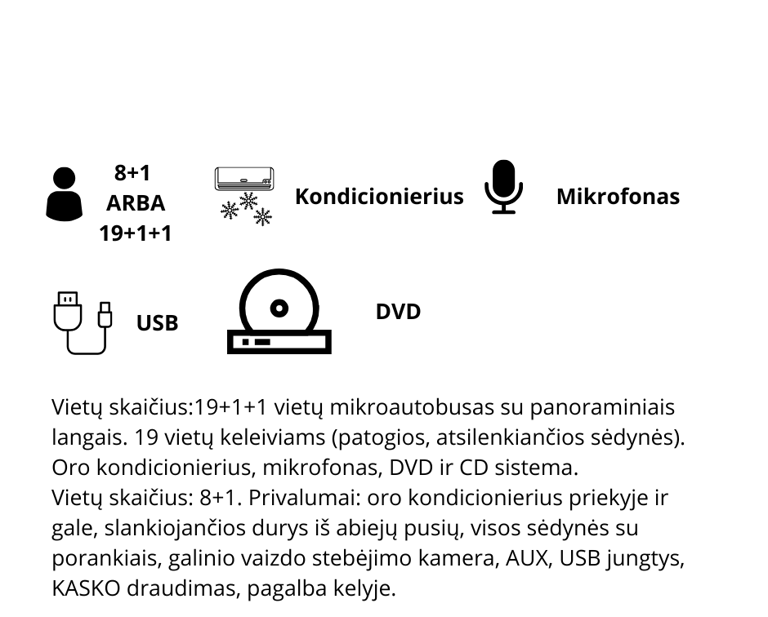 8 sėdimos vietos keleiviams ir 1 vairuotojui;